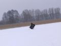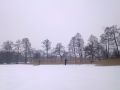 Zasypane śniegiem jezioro Łąke, a na nim wędkarze podlodowi. (Mała Wólka)
