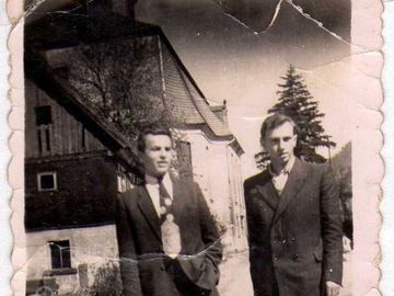 Zbylutów. Rok ok.1950.Fragment kościoła ewangelickiego oraz budynku przed kościołem. (Zbylutów)