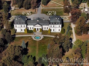 Zdjęcie lotnicze Pałacu w Sieniawie. kompleks parkowy Sieniawskiego , Czartoryskich. Widok z lotu ptaka. Fotografia lotnicza.