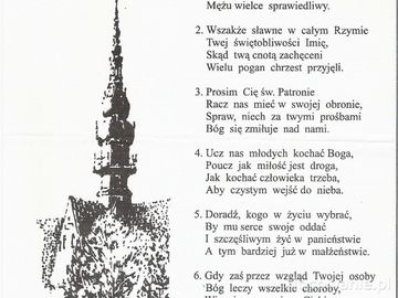 ze zbiorów prywatnych: z kaplicy pw. św.Walentego - tekst pieśni. Nie taki święty ten Walenty ! - otóż z wykształcenia był lekarzem, z powołania duchownym. Żył w III wieku w Cesarstwie Rzymskim za panowania Klaudiusza II Gockiego i wbrew jego zakazom jako biskup udzielał ślubów i błogosławił młodych legionistów i ich wybranki. Został za to wtrącony do więzienia i stracony.