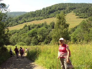 zejście od Schroniska PTTK Jaworzec, w dole rzeka Wetlina a na niej - dalej - Rezerwat "Sine Wiry', za rzeką zbocze góry Pereszliba - 769m npm. W takich miejsc (Wetlina)