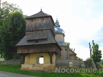 zespół cerkiewny - otoczony murem z kamienia dzikiego, po prawej widoczne szkarpy wspierające mur, na przedzie : piękna drewniana brama - dzwonnica, o trzech kondygnacjach, prawdopodobnie z XVw., w niej na pięterku urządzona była kaplica cerkiewna, zaś wyżej - dzwony z 1624 i 1625r. - to unikalny przykład tzw. "cerkwi wieżowej", polecam : Kotań, Świątkowa Mała, Owczary.