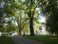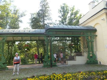 Zespół Pałacowo - Parkowy - n/z do bryły pałacu przylega oranżeria, dalej park ze stawem i wyspą, obiekty odnowione, otoczenie zadbane, ukwiecone.