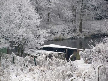 Zimowa sceneria terenu przy ulicy Mickiewicza, nad rzeką Wdą, oraz przy budynku Urzędu Miejskiego.  (Czarna Woda)