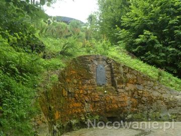 źródełko poświęcone Fryderykowi Chopinowi, z medalionem przedstawiającym popiersie kompozytora. Wyżej - w prześwicie - fragment platformy widokowej.