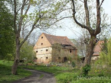 Zrujnowany budynek folwarczny ze śladami dawnej urody